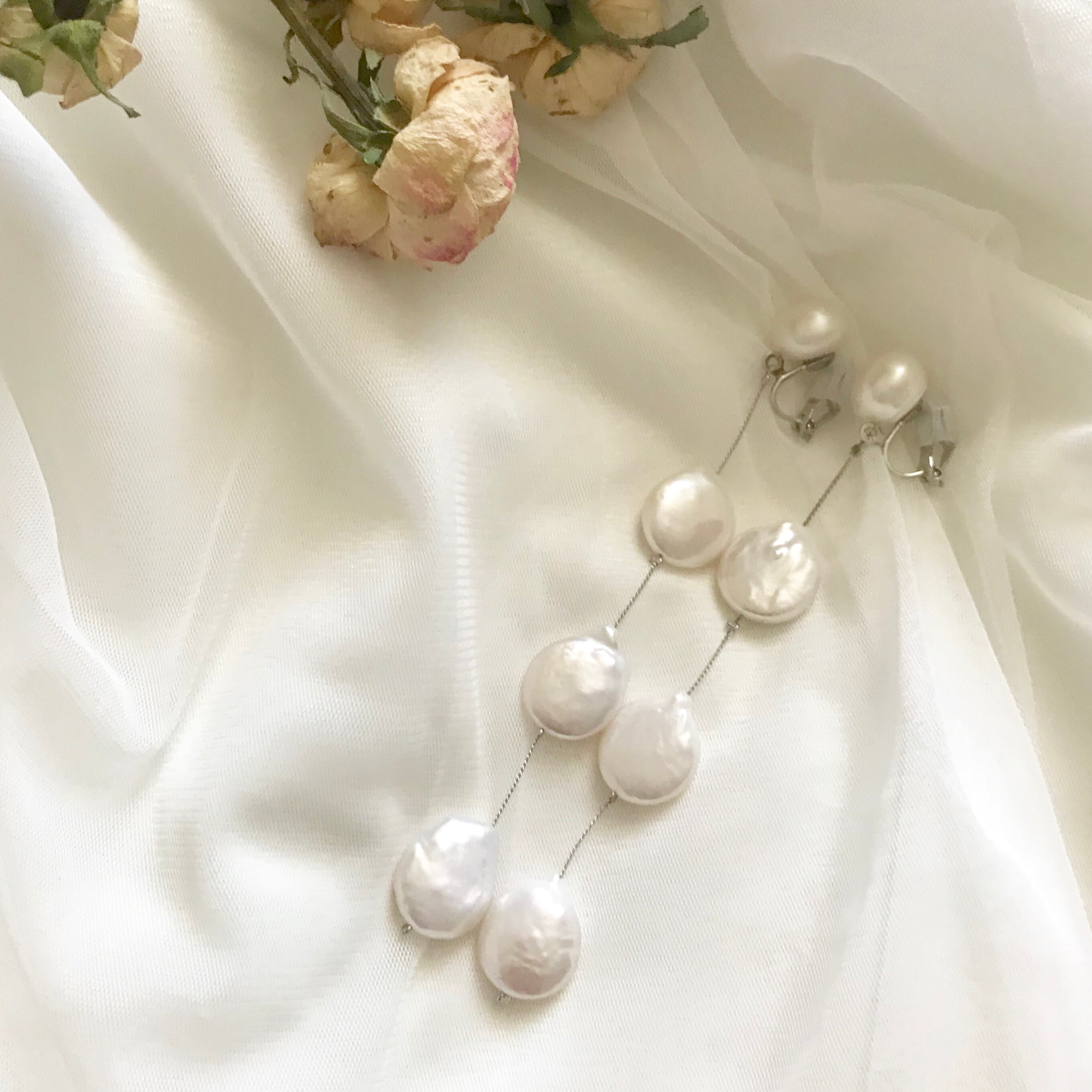 こちらの商品は天然石の淡水パールを使用しておりますので、一粒一粒形状が異なります。